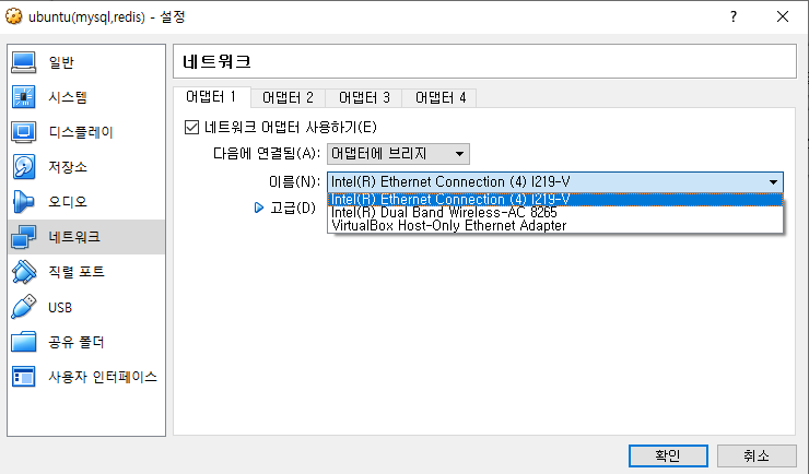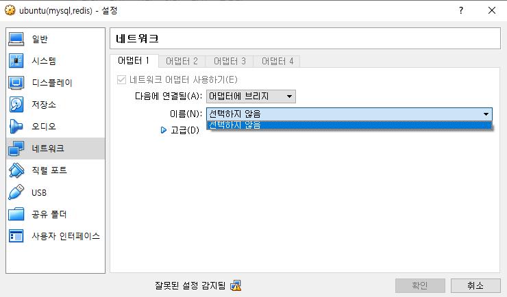 설정을 가보니 네트워크 어댑터 브리지에 목록이 없는 상태로 나온다..