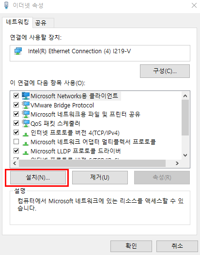 2. 이더넷 속성에서 설치