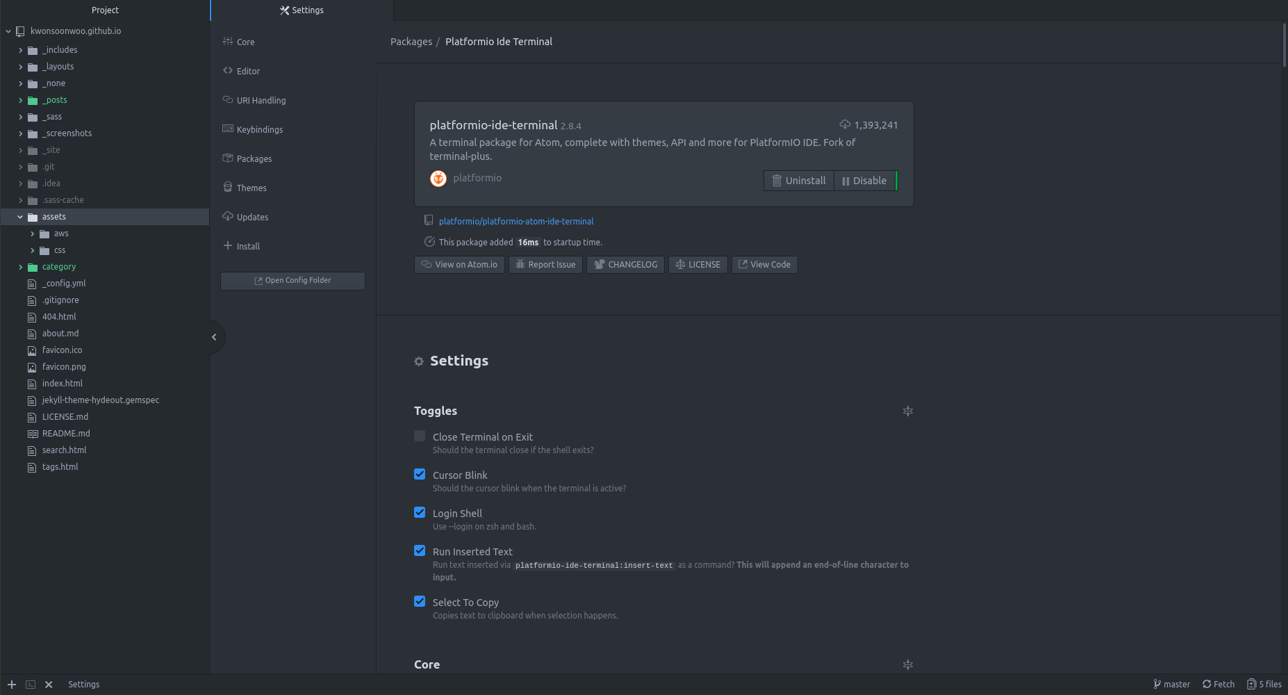 터미널의 테마변경이나 키바인딩 등은 Packages -> platformio-ide-terminal로 가서 하면 된다.