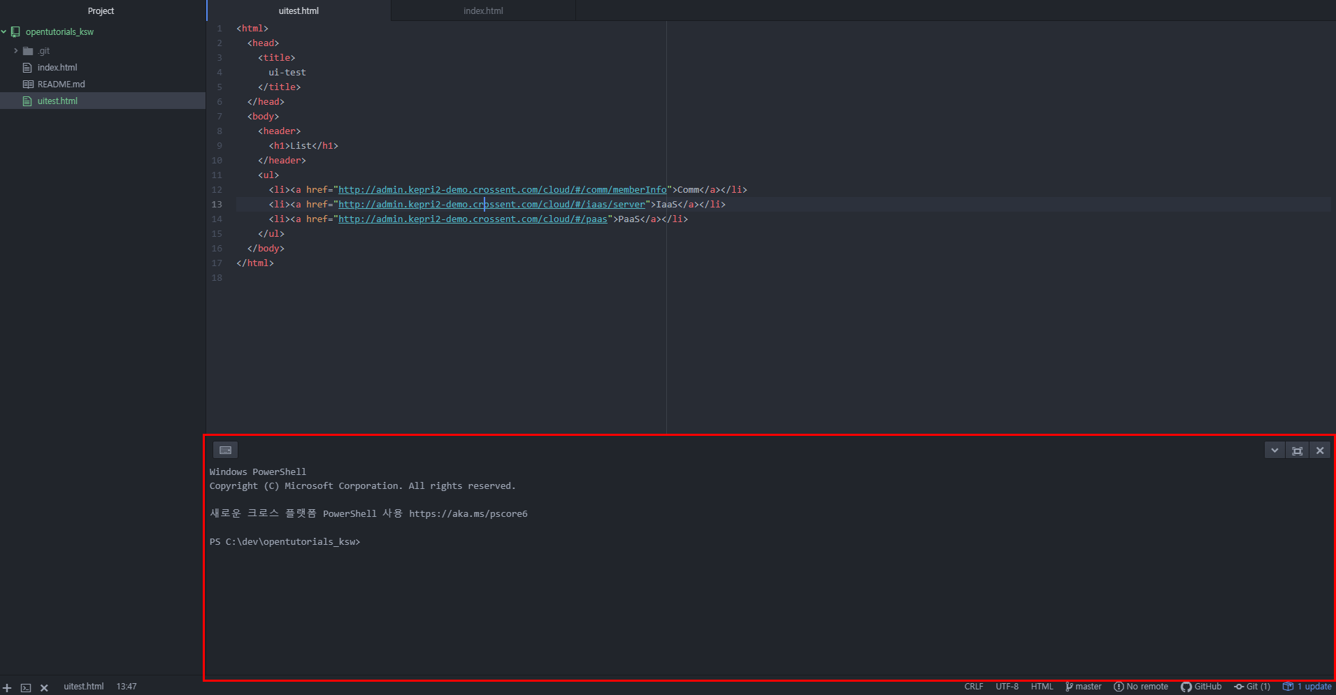 터미널 실행키는 Ctrl + ` (숫자키 1 왼쪽에 있는 버튼) 로 실행하거나