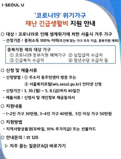 "코로나 19로 생계가 어려워진 취약계층에 가구별 30만 원에서 50만 원까지 재난 긴급 생활비를 지원."