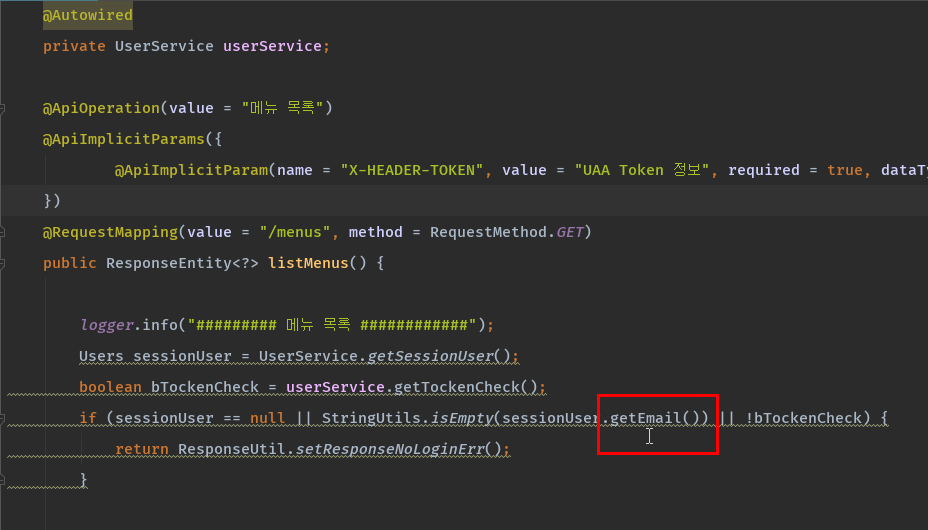 Intellij를 다시 깔고 나서 기존 프로젝트의 method에 아래와 같이 에러메시지가 나왔다.