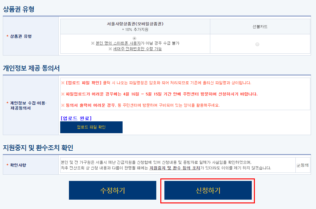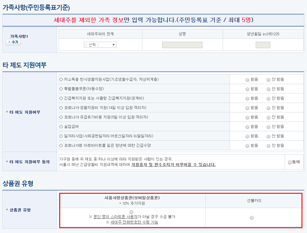 신청서 작성시 상품권 유형은 기존에 말씀드렸듯이 서울사랑상품권 과 선불카드 로 나눠져 있는데요