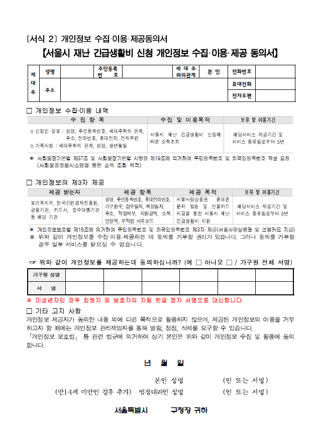 다운받아 작성한 개인정보동의서는 신청서 작성할 때