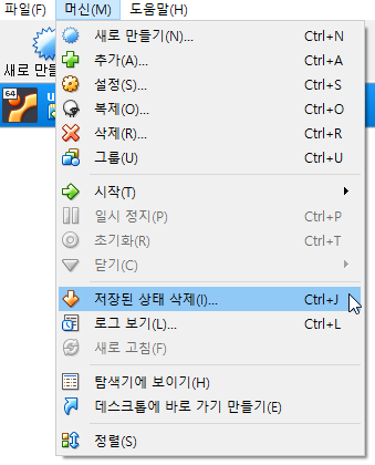 1. 메뉴에서 머신(M) -> 저장된 상태 삭제(I)... 선택