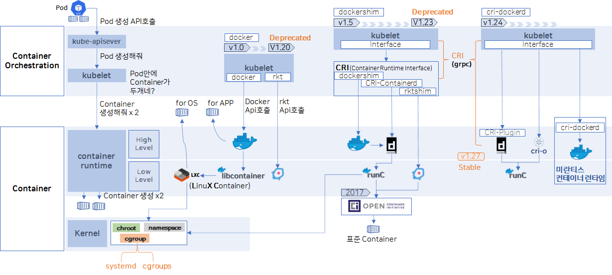 1. 이 부분의 핵심은 kubelet의 변화 와 컨테이너 런타임(CRI)들 간의 흐름