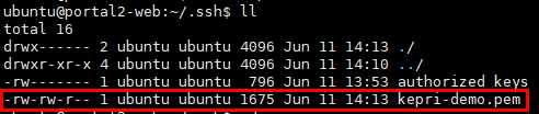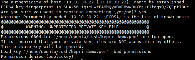 FileZilla를 이용해 pem 키를 업로드 했더니 권한이 664로 되어있었다(-rw-rw-r)