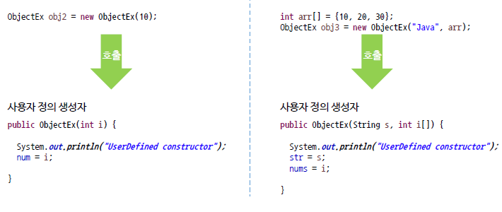 디폴트 생성자 외에 특정 목적에 의해서 개발자가 만든 생성자로, 매개변수에 차이가 있다