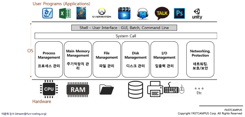 - System Call이 명령을 받아서 Hardware에 적절히 배분
